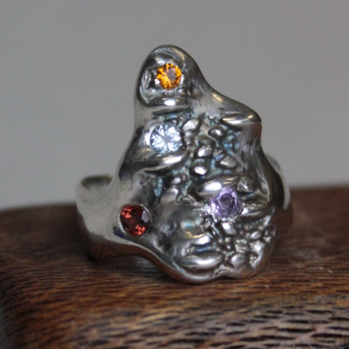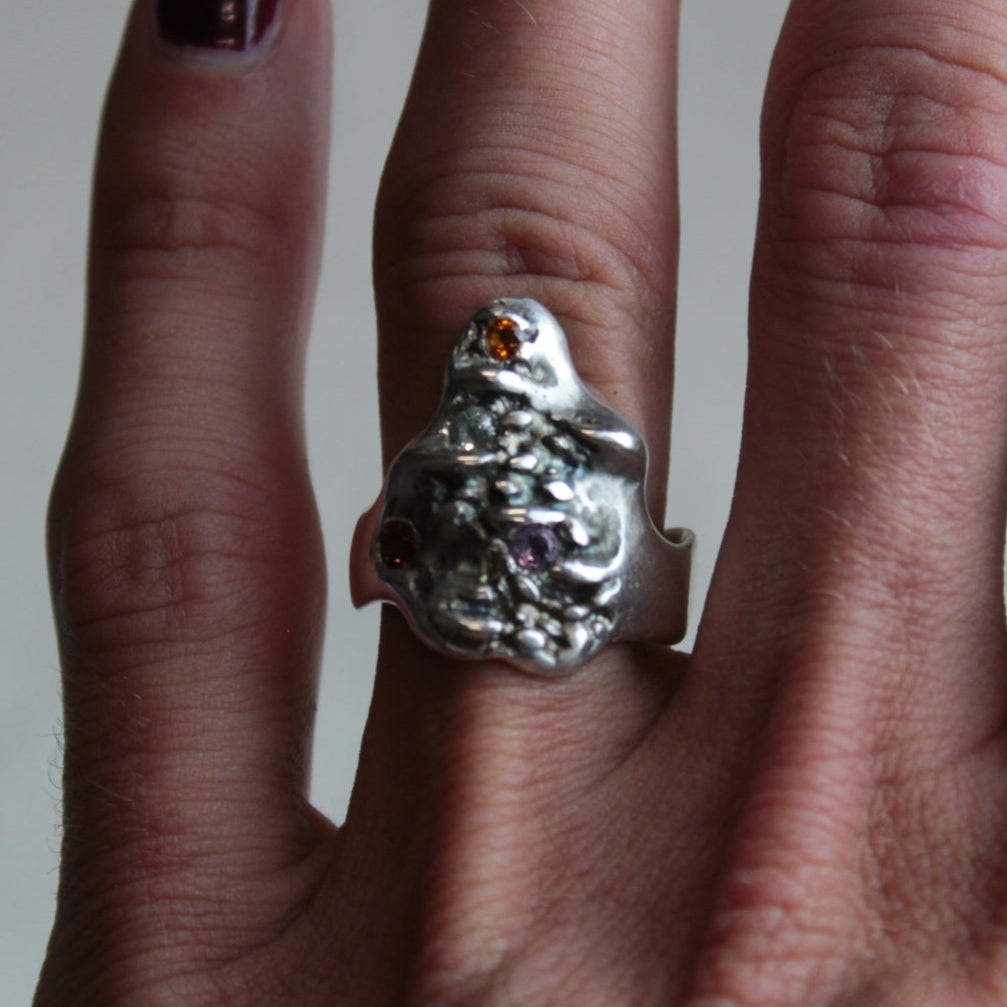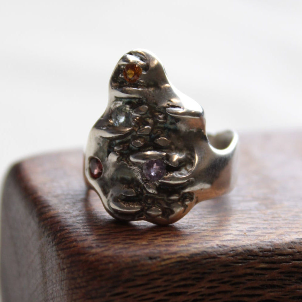 - A stamp was made (the negative) of a Banksia seed pod and used to press the design into wax (the positive) then carve the ring (see product image).