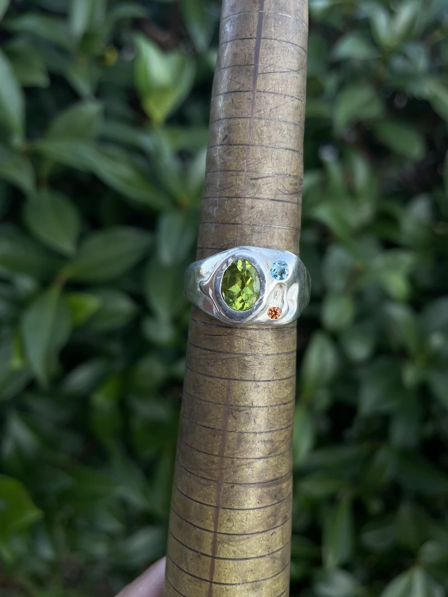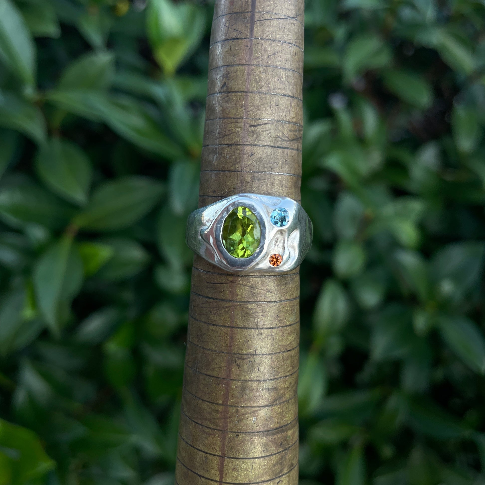 Named after Murakami's wizard character Howl in Howl's Moving Castle. This one is set with an oval peridot (lab), a 3mm natural topaz and 2mm natural orange sapphire.