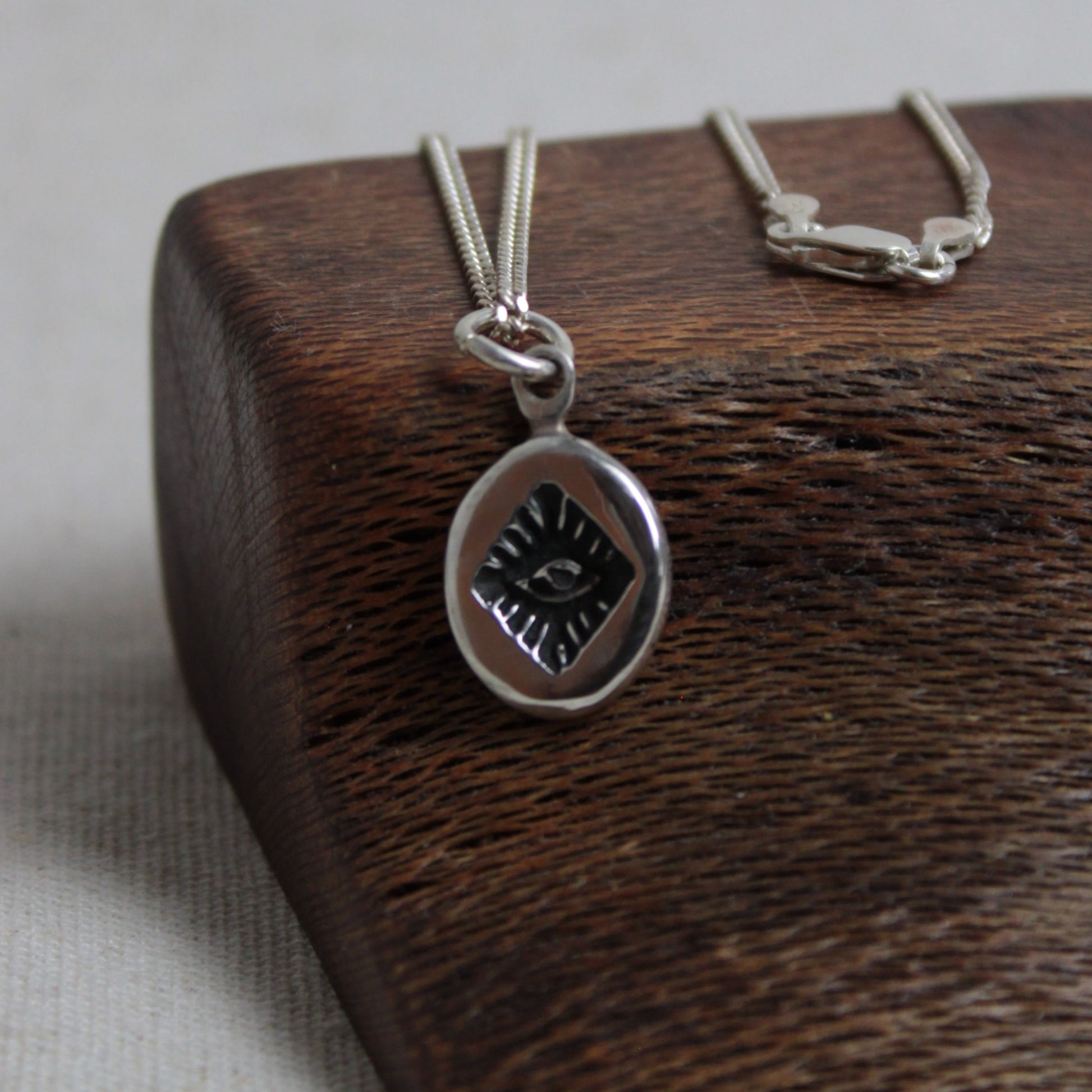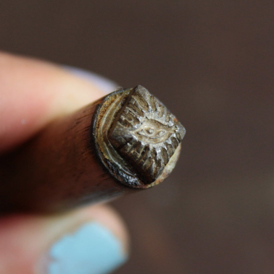 - The eye stamp (the negative) was first hand carved and casted, then used to press the design (the positive) and carve the pendant.