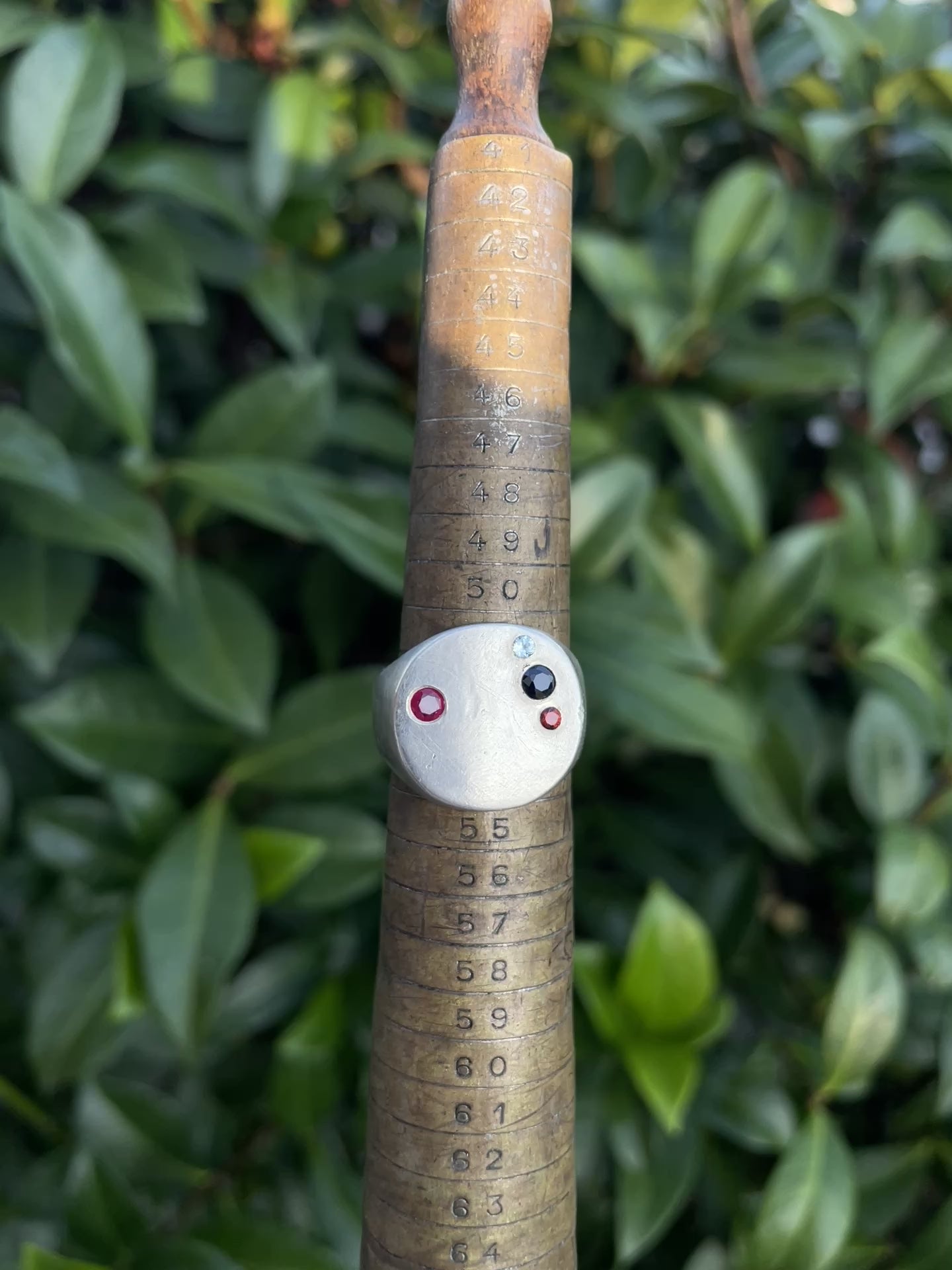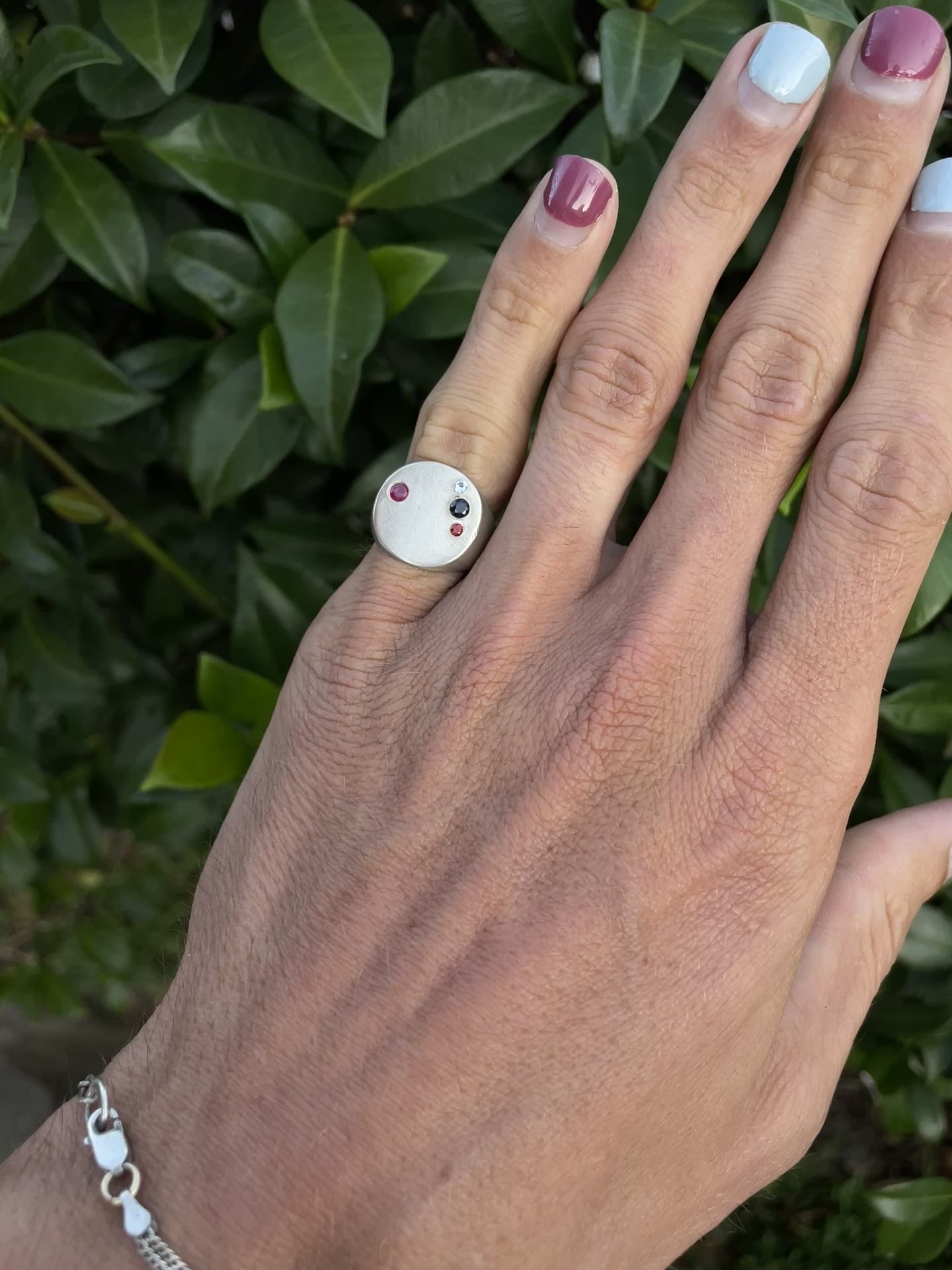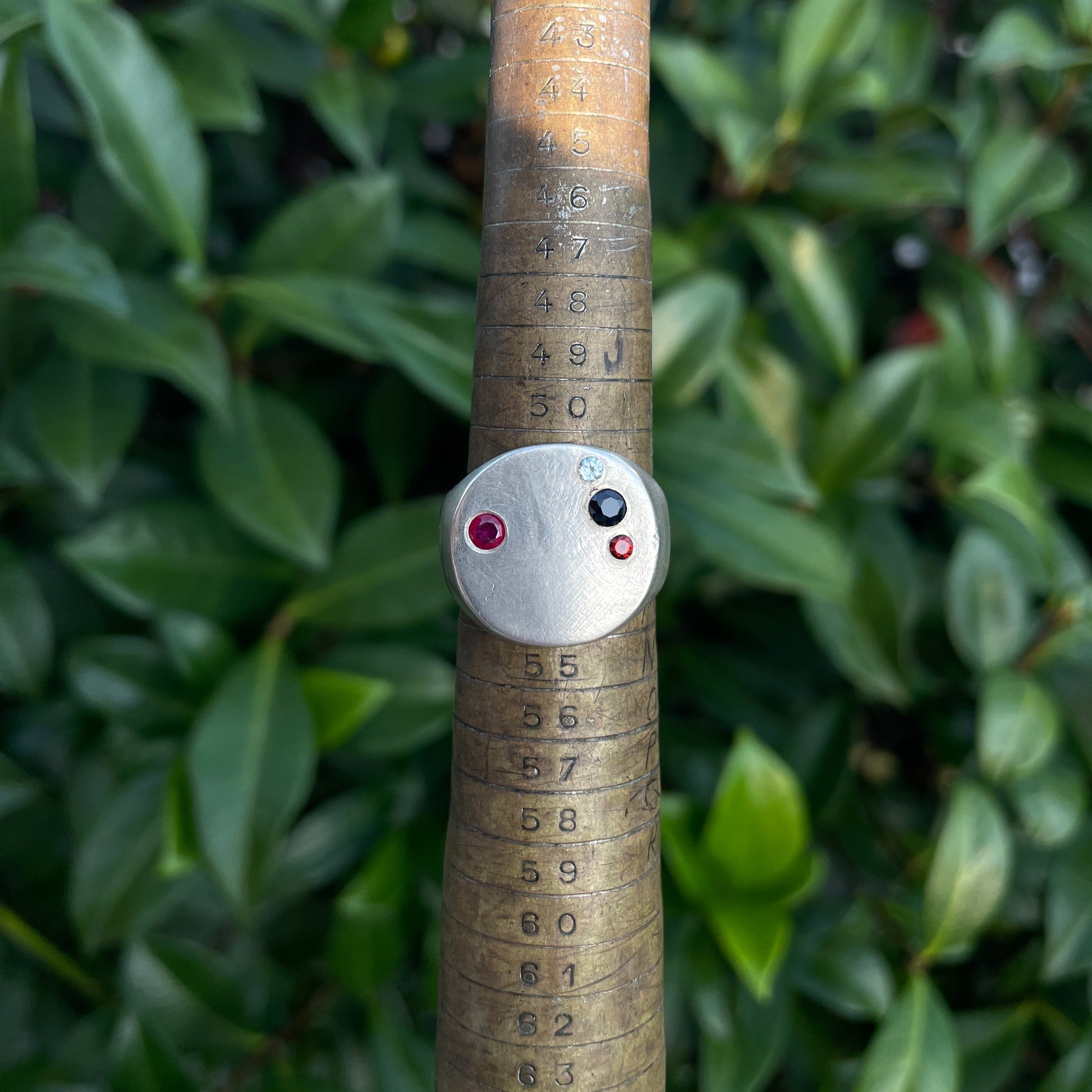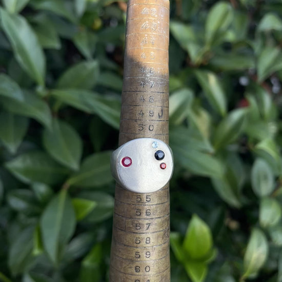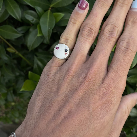 The minimal circle signet has a thin wide face that sits close to your finger. This one is finished with a matte finish and has 4 gemstones set in the face, including: