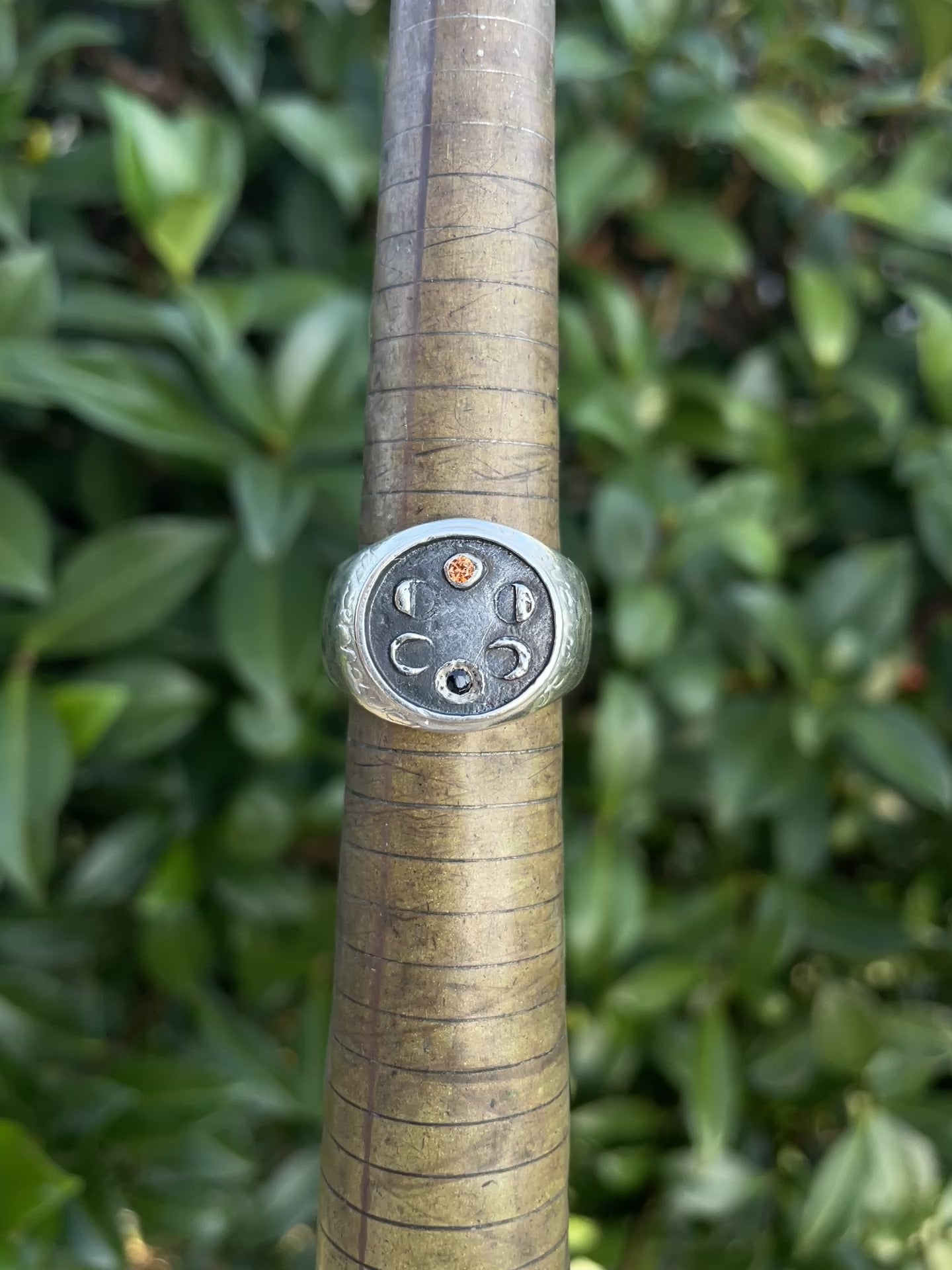 - The moon phases signet has the sequential moon phases cycle emerging from the face with a natural orange sapphire set as the full moon and a natural black sapphire as the 'no moon.'