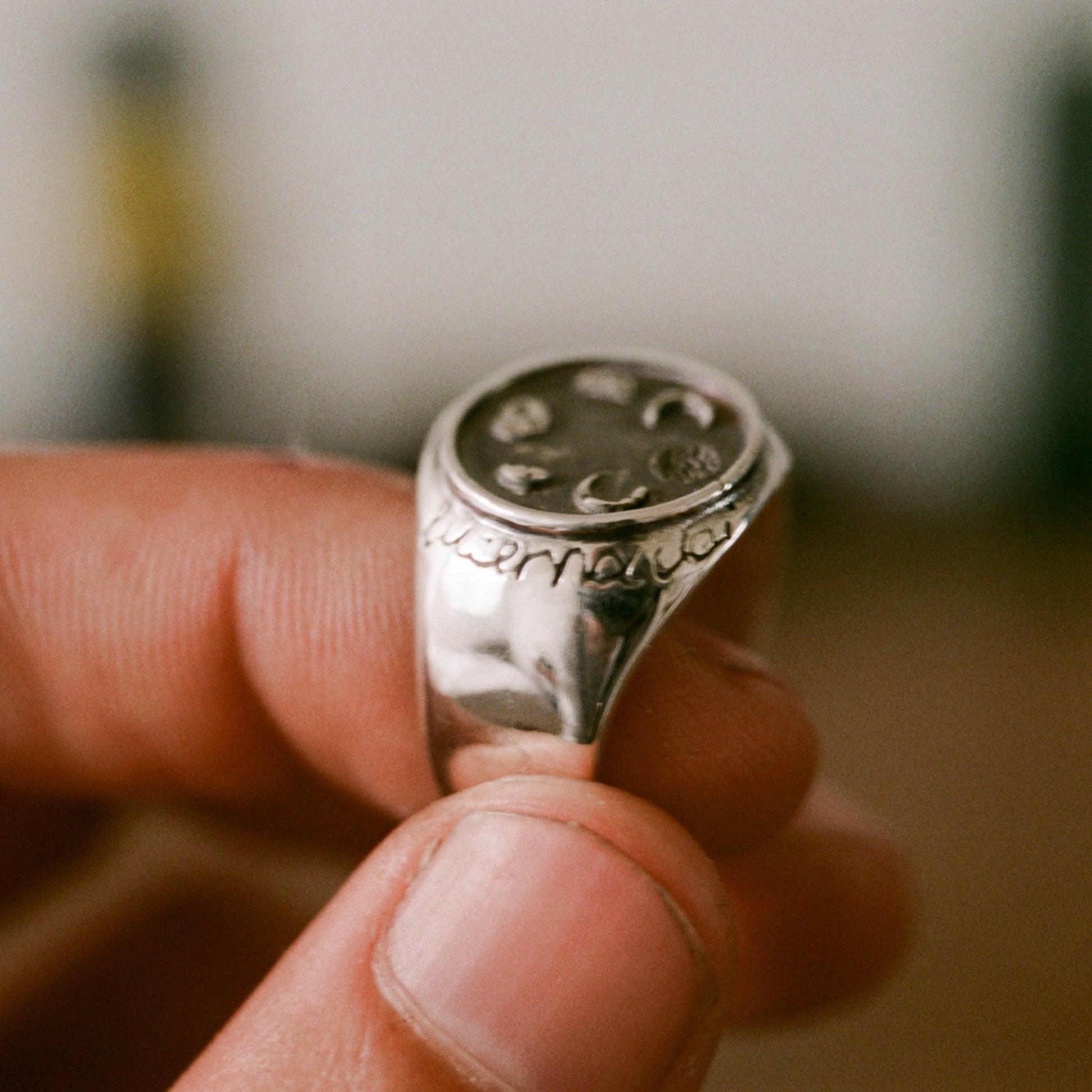 - The moon phases stamp (the negative) was first hand carved and casted, then used to press the design (the positive) and carve the ring.